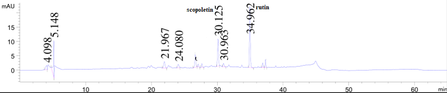 Flavonoid and coumarin compounds have been identified and quantified in Lycium barbarum L. fruits by high-performance liquid chromatography (RP HPLC-DAD) with diode-array [44]. The identification by RP HPLC-DAD is based on the comparison of the UV absorption spectrum and a time (RT) with corresponding standard compounds: rutin of the flavonoid group and scopoletin of the coumarin group (fig. 4).