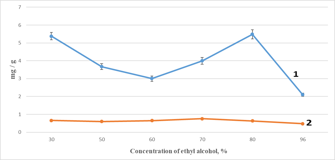 Rutin was the main flavonoid compound in Lycium barbarum L. fruits with a value of 2.10-5.48 mg/g dry sample (in calculation on rutin). The total yield of rutin depends on the solvent concentration. The maximum amount of rutin extracted from Lycium barbarum L. fruits (5.48±0.26 mg/g) is extracted with 80% ethanol, and the minimum yield is when using ethanol with a 96% concentration (2.10±0.09 mg/g). With ethanol, the amount of extracted rutin is also high at 5.48±0.26 mg/g. Then with an increase in ethanol concentration, the amount of extracted rutin decreases to 3±0.15 mg/g, then increases again with ethanol 80%. The maximum amount of scopoletin extracted from Lycium barbarum L. fruits (0.76±0.03 mg/g) is extracted with 70% ethanol, and the minimum yield is when using ethanol with a 96% concentration (0.48±0.02 mg/g). The total yield of scopoletin is almost constant despite the solvent concentrations. The results are shown in (fig. 5).