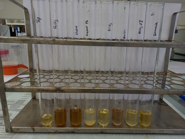 Fig. 5: Chromogenic reactions for (a) polysaccharides/Fehling test, (b) flavonoids
