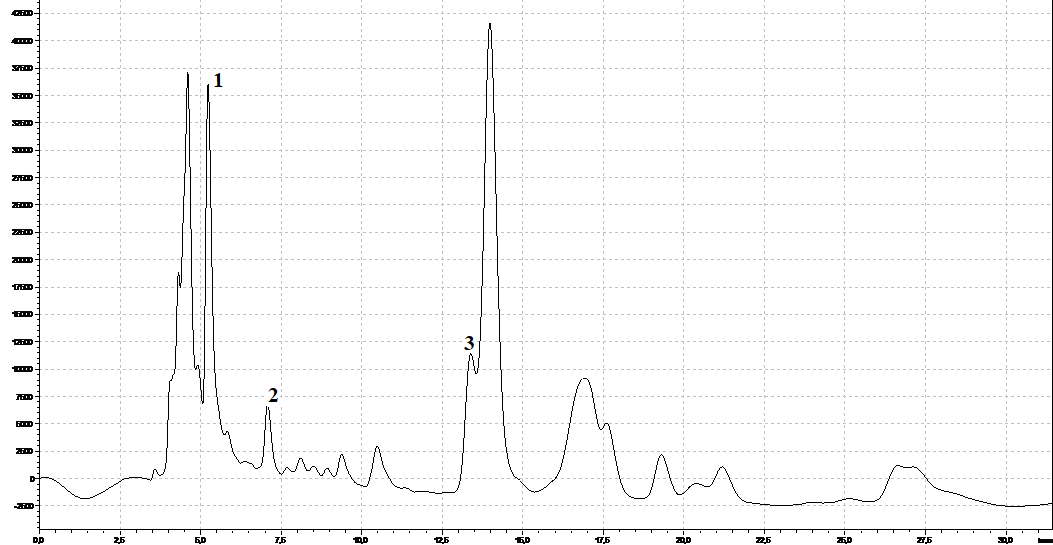 Fig. 6: Chromatogram of Lycium barbarum fruits extract at 210 nm. 1-tartaric acid, 2-malic acid, 3-citric acid (n=5, p<0.05)