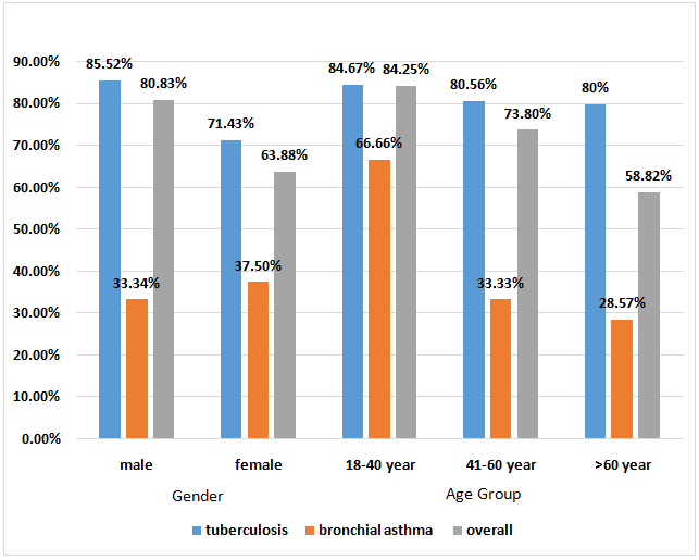 Fig. 1: Percentage of adherence in different variables among tuberculosis, bronchial asthma, and overall