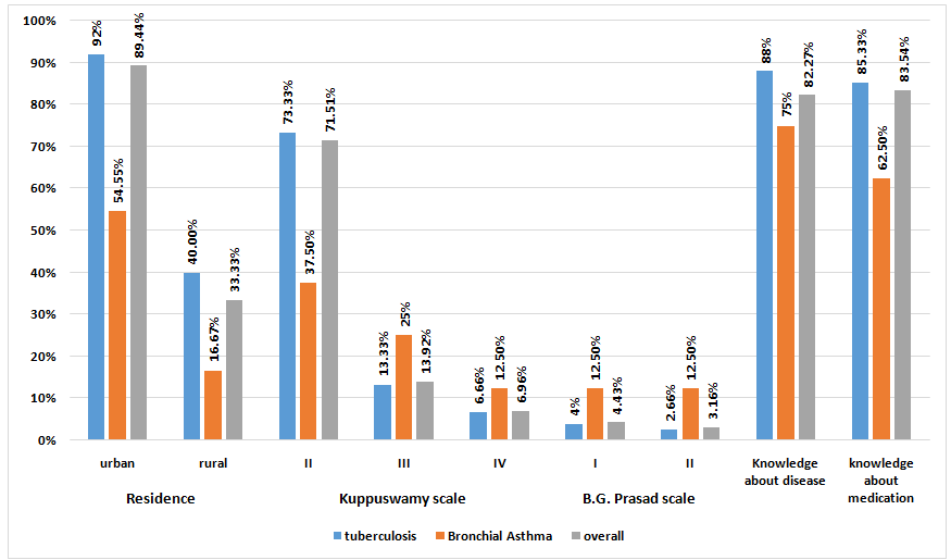 In Tuberculosis patients, upper-middle-class patients as per modified kuppuswamy classification of socioeconomic status were more pharmacotherapeutic adherent (73.33%) in comparison to other classes (Lower middle class 13.33%, upper lower class 6.66%. In bronchial asthma patients, upper-middle-class patients as per modified kuppuswamy classification of socioeconomic status, were more pharmacotherapeutic adherent (37.50%) compared to other classes (Lower middle class 25%, upper lower class 12.5%). As the patients in the lower middle class stuck to the medications prescribed by the physician but the patients in the upper-middle-class population are well educated so they alter the continuation of the medication. Overall upper-middle-class patients as per the modified kuppuswamy classification of socioeconomic status, were more pharmacotherapeutic adherent in comparison to other classes. Kuppuswamy scale of socioeconomic status (which consists of the complete score of occupation, education, and total monthly income of the head of the family), because the upper-middle-class population is well educated and their attitude towards taking medication is good.