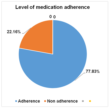 Among the total 203 patients, 158(77.83%) were considered adherent according to Morisky's instrument while 45(22.16%) patients were non-adherent.