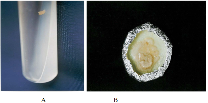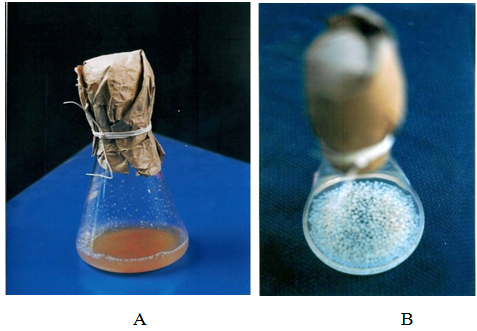 Fig. 2 A: One week old suspension culture, B: Suspension culture cells entrapped in sodium alginate beads