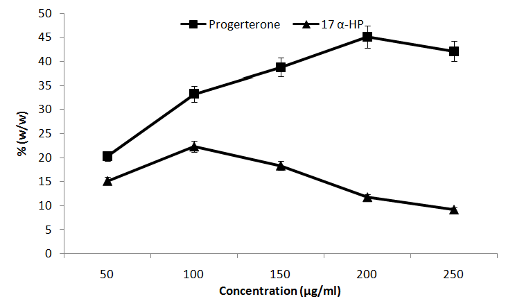 The initial experiment was performed to determine the optimum concentration of progesterone that can be fed to give maximal biotransformation yield. In order to investigate the effect of fed precursor (progesterone) concentration on biotransformation, cell suspension culture (20 %v/v) was incubated into MS medium containing various concentration viz. 50 μg/ml, 100 μg/ml, 150 μg/ml, 200 μg/ml and 250 μg/ml of progesterone and after 12 days of incubation under similar conditions mentioned earlier, samples were extracted and analyzed.