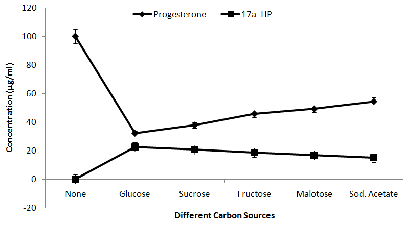 Fig. 6: Effect of various Carbon source on biotransformation.12 days after addition of progesterone (100μg/ml), the pattern of17 α-hydroxyprogesterone were determined