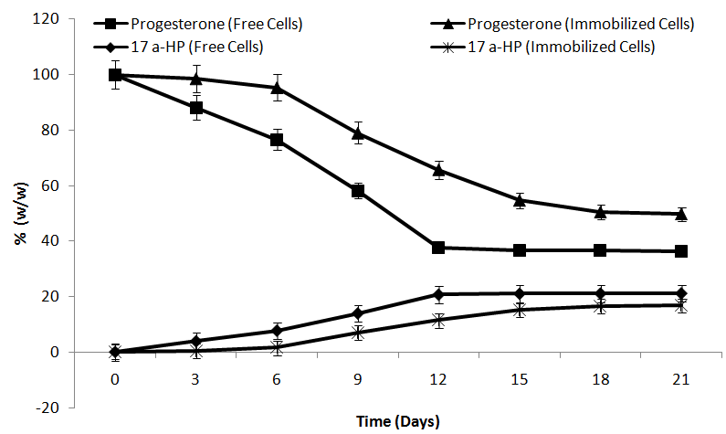 The results demonstrate the ability of freely suspended cells and calcium alginate entrapped cells of C. roseus to yield the biotransformation product i.e. 17α-hydroxyprogesterone under a variety of culture conditions. In all cases, the ability to hydroxylated progesterone could be correlated with viability of both types of cells. The difference between the rates of progesterone transformation by free as well as immobilized cells is probably due to a diffusion barrier.