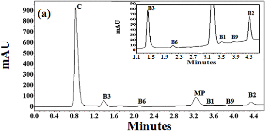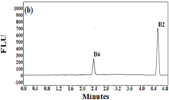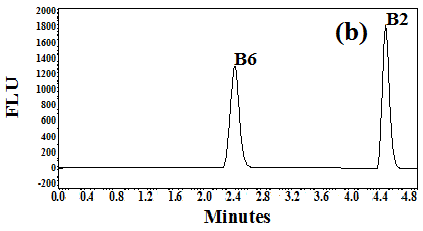 Fig. 1: (a): general view chromatogram of (B1, B2, B3, B6, B9, B12 and C) and methyl paraben as an internal standard at 270 nm with UV-DAD detection. (b): chromatogram of (B6, B2) with FLD detection