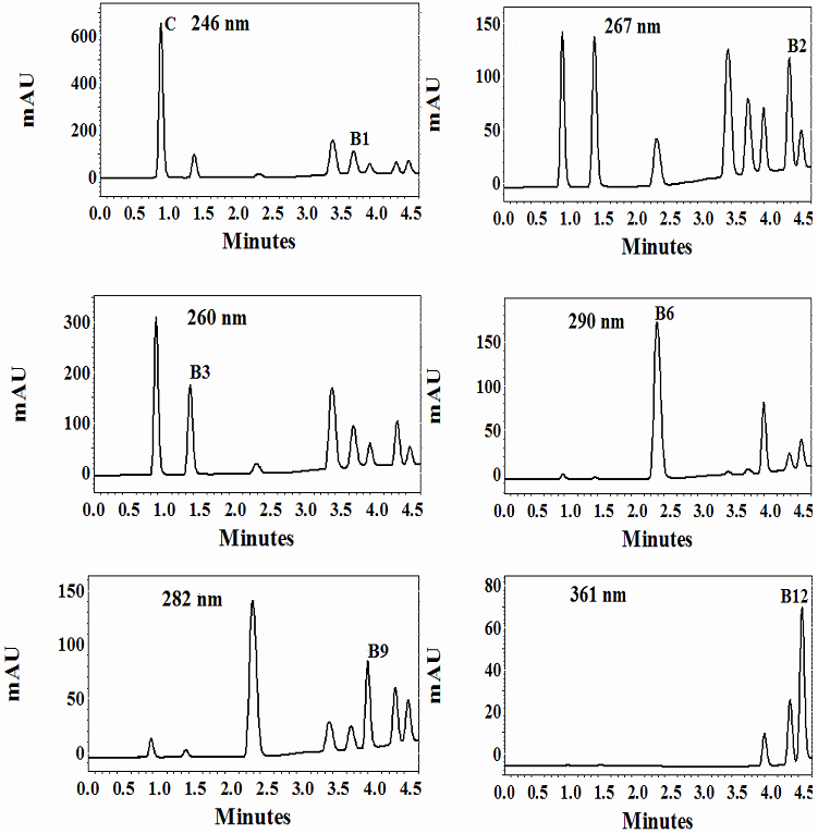 The UV-Vis. photodiode array detector enables to simultaneous determination of investigated compounds at different wavelengths. Thus, in this study, HPLC-DAD detection can give us high absorption of every vitamin, so we have the ability to determine each water-soluble vitamin in specific wavelength and with FLD detector simultaneously. We can determine the quantity and quality of trace amounts of vitamins in samples with excellent precision, so we can determine the smaller amount of each vitamin in different products correctly and in one step.