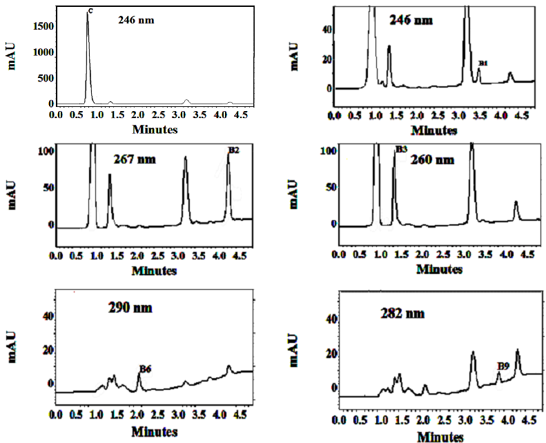 Under new chromatographic conditions, the typical chromatograms of standard solution of water-soluble vitamins (B1, B2, B3, B6, B9, B12 and C) at 270 nm for UV-DAD detector as a general view and for FLD detector at the same time, with methyl paraben as internal standard are presented in fig. (1). The values of retention times were: 0.887 min for C, 1.340 min for B3, 2.207 min for B6, 3.560 min for B1, 3.860 min for B9, 4.267 min for B2 4.493 min for B12, and 3.253 min for methyl paraben, for DAD detector and 2.413 min for B6, 4.513 min for B2 for FLD detector. Fig. (2) represent the typical chromatograms of vitamins (B1, B2, B3, B6, B9, B12 and C) standard solutions with DAD detector at 246 nm for C and B1, 267 nm for B2, 260 for B3, 290 for B6, 282 nm for B9, 361 nm for B12 with methyl paraben as internal standard.