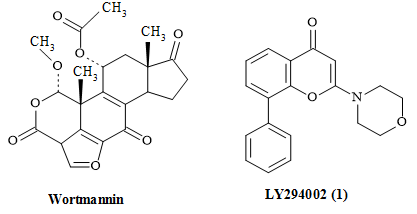Chromenones are important class of bioactive molecules consisting of chromen-2-ones and chromen-4-ones. The flavones, isoflavones, flavanoids and coumarins have been extensively studied phyto constituents belonging to chromen-2-ones and chromen-4-ones class. Chromenones possess derivatives possess diverse pharmacological activities including antitumor [1, 2], antivascular [3], antimicrobial [4, 5], antioxidant [6], TNF-a inhibitor [7], antifungal [8], anticoagulant[9], anti spasmolytic [10, 11], estrogenic [12, 13], antiviral[14], anthelminthic [15], anti-HIV [16], antitubercular [17, 18], anti-inflammatory [19, 20], herbicidal [21], analgesic [22] and anticonvulsant [23, 24] activity. Wortmannin and LY294002 (1) (fig. 1) are the benchmark phosphatidylinositol 3-kinase (PI 3-K) inhibitors and inhibit other kinases from PI 3-K family viz. DNA-dependent protein kinase (DNA-PK).