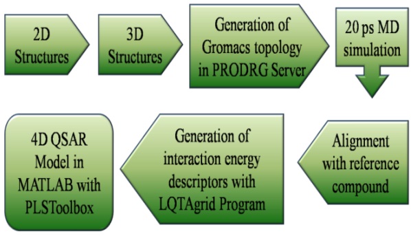 Initially 2D structures of dataset compounds were drawn in Marvin application interface and after adding explicit hydrogen structures were converted in 3D. Further computational steps are depicted in fig. 2.