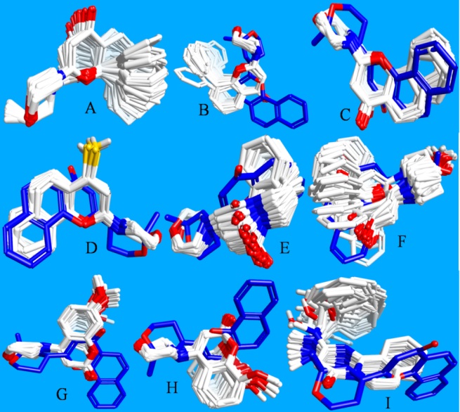 Fig. 3: 3 Alignment of conformers generated during MD simulation (CEP) (A) Aligned CEP of most active (reference) compound 22; (B) CEP of active compound 1 aligned with compound 22 (compound 22 shown blue colour); (C) CEP of active compound 2; (D) CEP of active compound 3; (E) CEP of active compound 12; (F) CEP of less active compound 21; (G) CEP of least active compound 30; (H) CEP of less active compound 31; (I) CEP of less active compound 45