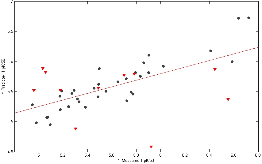 Fig. 4: Predicted pIC50 values against measured pIC50 values for training set and test set compounds (Black circles: training set compounds; red triangles: test set compounds)