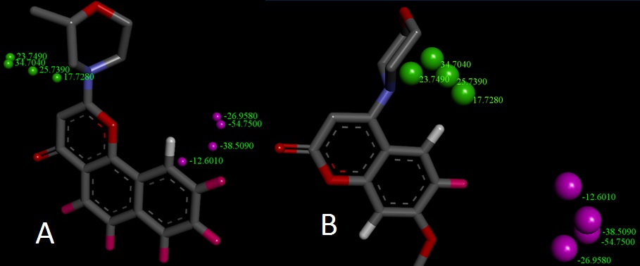 Fig. 5: Interpretation of interaction energy descriptors. (A) Interaction energy descriptors around most active compound 22; (B) interaction energy descriptors around least active compound 30