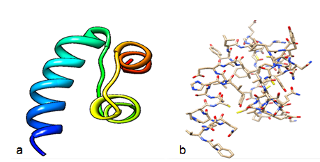 Fig. 1: Structure of plant insulin extracted from Canavalia ensiformis, accession number Q7M217 [a] protein in round ribbon and [b] stick representations