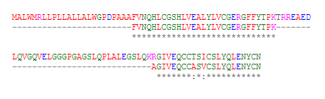 The insulin-like growth factor domains of human insulin are common to the insulin sequence in Canavalia ensiformis, Vigna unguiculata and Bauhinia purpurea [19]. These three plants belong to the same class: Leguminosae. We selected Canavalia ensiformis for testing as an insulin source because it has been tested in wet-laboratory experiments and because it has a highly identical homolog to human insulin protein (table 1). In a wet-laboratory experiment, this protein was recognized by anti-human insulin antibodies, lowered the blood glucose levels of alloxanized mice (suggesting that it possesses biologic potency against DM), and found to have evolutionary characteristics similar to those of human insulin [36]. Sequence alignment by Clustal Omega (Conway Institute UCD Dublin, Dublin, Eire) [37] of human insulin protein is shown in table 1 along with the plant homolog.