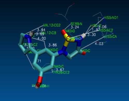 Fig. 2: Binding interaction of docked lead compound T6 with active-site residues with the lead compound represented in bond formation. Red shows the hydrogen-bond acceptor and blue shows the hydrogen-bond donor. White shows the hydrogen bond and yellow represents electronegative compounds such as halogens