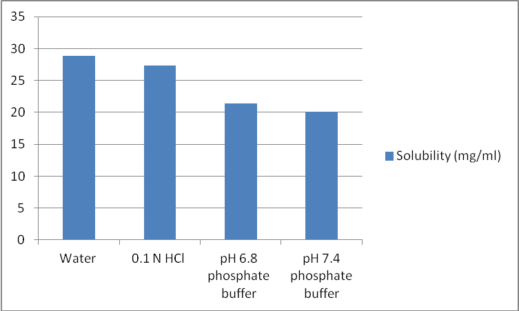 The solubility of zidovudine in water, 0.1 N HCl, phosphate buffer pH 6.8 and 7.4 was found to be 28.90 mg/ml, 27.36 mg/ml, 21.36 mg/ml and 20.1 mg/ml respectively shown in fig.1.