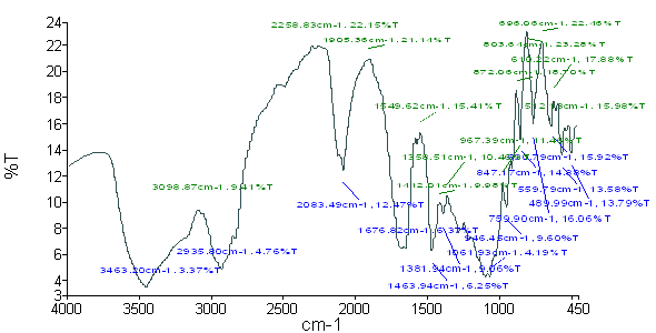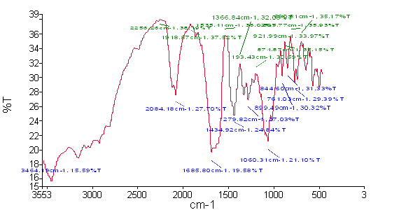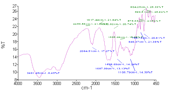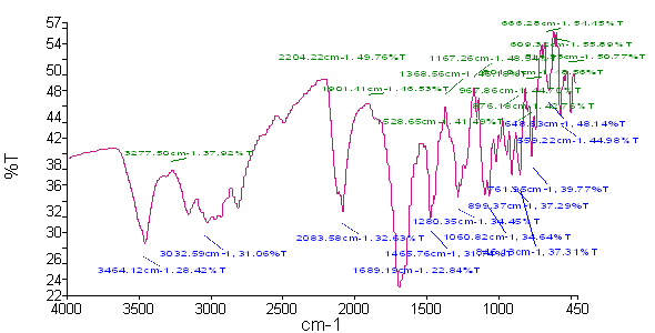 To study the interaction between drug and polymers used in the preparation of formulation, FTIR spectroscopic study was carried out for the test samples. FTIR can provide very useful information about functional group. The FTIR technique is to measure the absorption of various infrared radiations by the target material, to produces an IR spectrum that can be used to identify functional groups and molecular structure in the sample shown in fig. 5 FTIR spectrum of pure zidovudine and formulated microspheres were recorded by using FTIR 8400S (SHIMADZU, Japan). Appropriate quantity of KBr and micorspheres (in the ratio 100:2) were mixed by grinding in an agate mortar. Disk was made with about 100mg mixture under hydraulic pressure of 600 kg. Then the FTIR spectra were recorded between 4000 to 400 cm-1. The resolution was 2 cm-1.