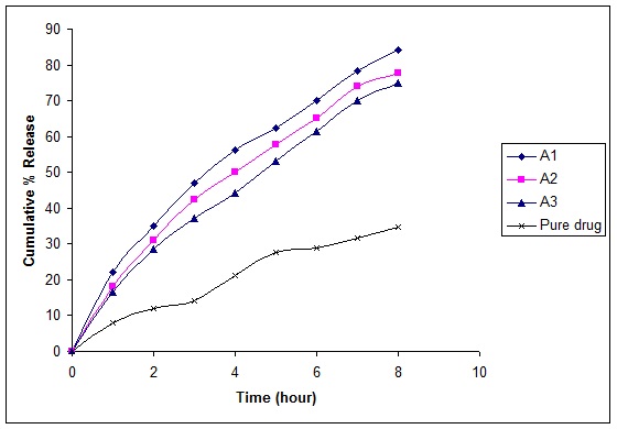 The in vitro dissolution studies were performed up to 8 hours using USP type II dissolution apparatus (VDA-8DR, VEEGO Instruments Corporation, India.) at 50 rpm. The dissolution medium consisted of phosphate buffer pH 7.4 (900 mL), maintained at 37 ±0.5 °C. An aliquot (10 mL) was withdrawn at specific time intervals and filtered through 0.45 μ (Millipore) filter. After that the samples were analyzed in UV-VIS spectrophotometer at a wavelength of 266 nm and cumulative percentage of the drug released was calculated.