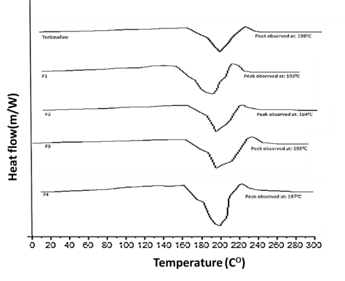 The peak observed for the drug was at 1980C, and the peaks obtained for B1, B2, B3, and B4 were at 192 °C, 194 °C, 195 °C, and 197 °C, respectively.