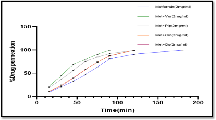 Conclusion: It was concluded from this research work that Piperine shows significant improvement in % drug permeation when compared using the f2 similarity index and its formulation with metformin may offer a simple and safe approach to enhance the pharmacological profile of metformin for effective anti-diabetic therapy in humans.