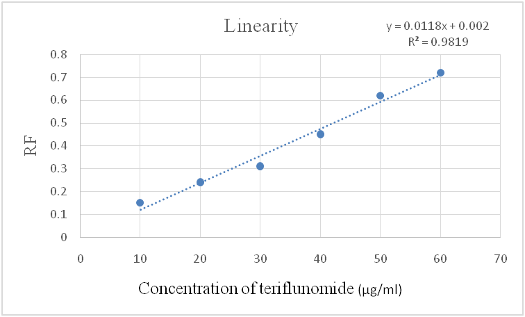 Results: The Rf value for Teriflunomide was found to be 0.46±0.04. The linearity range was observed from 10-60 µg/ml with a regression coefficient value of 0.9819. The developed method was validated for various parameters like specificity, linearity, accuracy, precision, recovery, and stability.