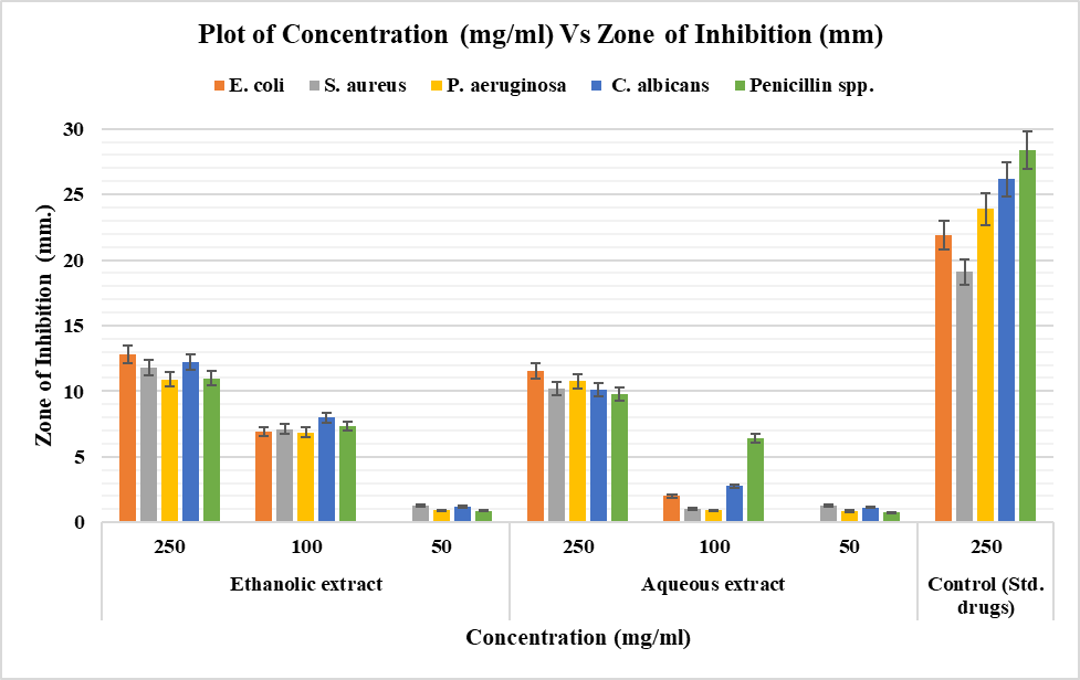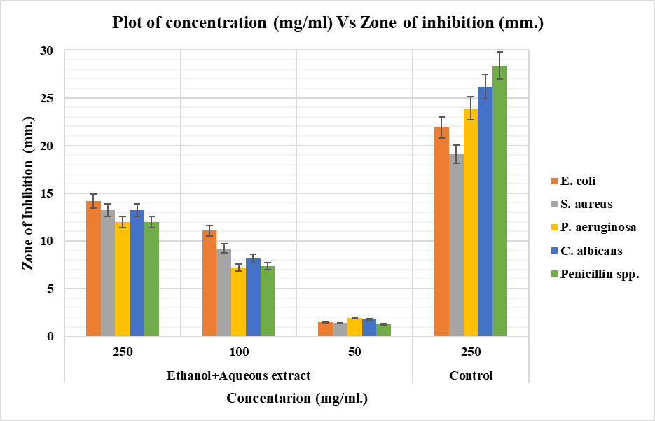 Results: The zone of inhibition ranged from 6.93±0.02b mm to 12.81±0.03a mm, with Escherichia coli being the most susceptible at 12.81±0.03a mm to the ethanol and 11.53±0.02a mm to the aqueous extracts at 250 mg/ml concentration while P. aeruginosa and Penicillin spp. were the slightest susceptible at 10.88±0.02a mm to the ethanol and 09.76±0.02a mm to the aqueous extract at 250 mg/ml concentration. The control/standard antimicrobial agent (Gentamicin and Metronidazole) exhibited higher inhibitory activity than the plant extracts. The least inhibitory value of 6.25 mg/ml was produced against P. aeruginosa by the ethanolic extract and against C. albicans by the combined (aqueous and ethanol) extracts of the plant. The qualitative and quantitative phytochemical screening of the leaves of Bergenia ligulata reveals the presence of flavonoids, tannins, saponins, alkaloids, and steroids. The most abundant percentage composition observed was flavonoids (7.72%), while tannins had the least component (4.29%).