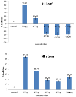 Fig. 1: Percentage inhibition of cell growth at different concentrations of H. indicum leaf and stem extracts.