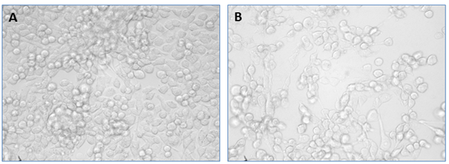 Fig. 2: Anticancer activity of extracts showing cell death, A-control; B-treated