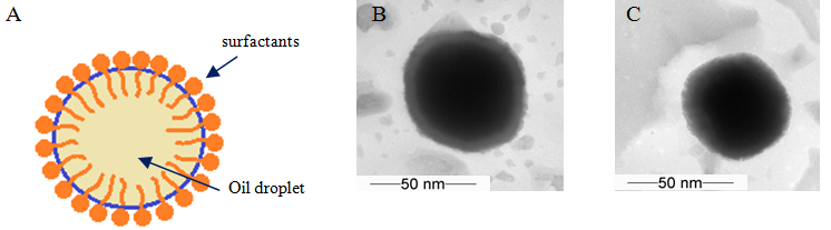 Fig. 1: The nanoemulsions structure (A), TEM of the nanoemulsions; V8 (B), EBV8 (C)