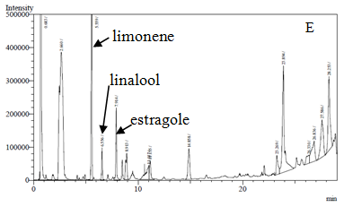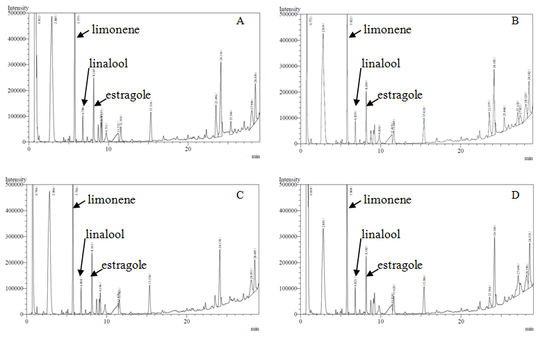 According to GC-FID analysis, a good chemical stability of all formulations was observed. The GC chromatogram of EBV8 showed three major peaks of volatile compounds; limonene, linalool and estragole which were used as markers (fig. 2). After storage at 4°C, 45°C, room temperature with and without light protection for 3 months and after heating-cooling cycling, the amount of limonene in all formulations did not significantly change (p<0.05) as same as linalool and estragole. These observations confirmed chemical stability of the volatile compounds consisting in the nanoemulsions. The results indicated that temperature and light are not affected to the stability of EB loaded in nanoemulsions.