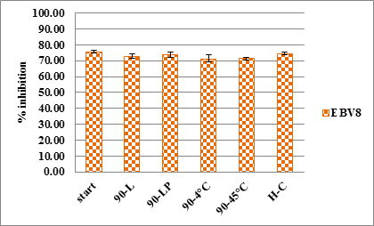 The physical stability of the EB loaded nano emulsions (EBV8) exhibited an average droplet size between 29.55 to 37.12 nm with PDI 0.06-0.18, as shown in table 3. The average droplet size of all formulations after stored at 4°C, 45°C, room temperature with and without light protection for 3 months and after heating-cooling cycling for 6 cycles showed a slightly changes, whereas the phase separation has not occurred. The polydispersity index (PDI) values of all formulations were less than 0.2 that indicated the relative homogeneity. Their zeta potentials were changed after storage at various conditions ranging between -14.51to -20.40 mV but these was not affected the physical changes of the formulations.