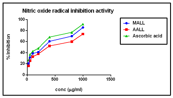 3.0 ml of 10 mmol sodium nitroprusside in phosphate buffer was added to 1 ml of different concentrations (25-1000µg/ml) of extract and reference. The resulting solution was then incubated at 25 °C for 60 min. A similar procedure was repeated with distilled water instead of extract, which served as a control. 5 ml of Griess reagent (1% sulphanilamide, 0.1% naphthylethylenediamine dihydrochloride, 2% H3PO4) was added to 5 ml of the incubated sample. The absorbance of chromophores formed during diazotization of nitrite with sulphanilamide and subsequent coupling with naphthylethylene-diamine dihydrochloride was measured at 546 nm using UV-spectrophotometer. Ascorbic acid was used as reference material. All tests were performed in triplicate [4].