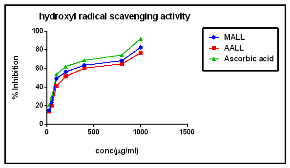 Fig. 2: Result of hydroxyl radical scavenging activity of MALL, AALL, and ascorbic acid, values are mean±SEM (n=3)