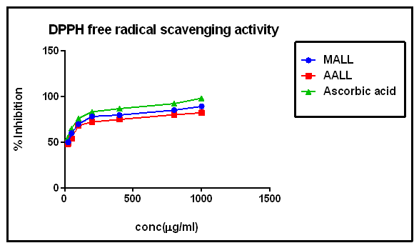 Fig. 3: Result of DPPH scavenging activity of MALL, AALL, and ascorbic acid, value are mean±SEM (n=3)