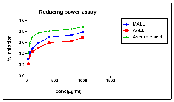 Fig. 4: Result of reducing power assay of MALL, AALL, and ascorbic acid, values are mean±SEM (n=3)