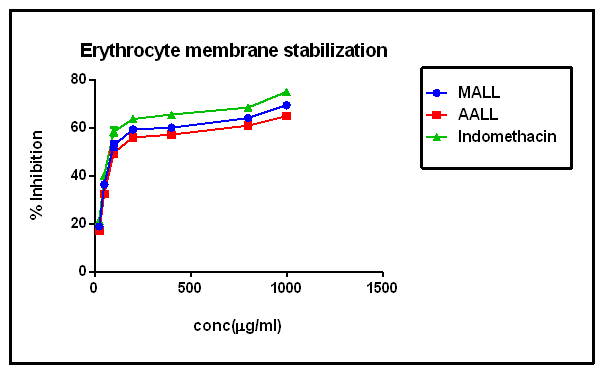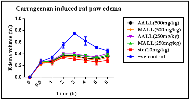 Female Sprague dawley rats weighing between 170-180g are fasted 16 h before treatment with water ad libitum. The animals were divided into 6 groups of 6 animals each. Paw edema was induced by injecting 0.1 ml of 1% carrageenan in sterile saline subcutaneously into the sub-plantar region of the rat right hind paw of animals which were pretreated with normal saline 2 ml/kg (Control), indomethacin 10 mg/kg (Standard), MALL 250 mg/kg, MALL 500 mg/kg, AALL 250 mg/kg and AALL 500 mg/kg, 30 min before the carrageenan injection. The paw volumes are measured plethysmographically immediately after injection of Carrageenan at 0, 0.5, 1, 2, 3, 4, 5 and 6 h. Inhibition of Inflammation was calculated as the increase in volume (ml) of the paw after treatment. The percentage inhibition of edema was calculated by the following equation.