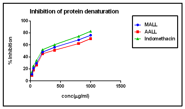 Fig. 6: Result of Effect of indomethacin, MALL, and AALL on protein denaturation, Values are mean±SEM (n=3)