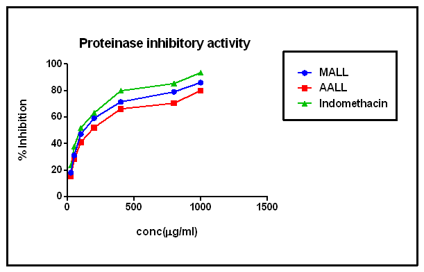 Fig. 7: Result of the effect of indomethacin, MALL, and AALL on proteinase inhibition, values are mean±SEM (n=3)