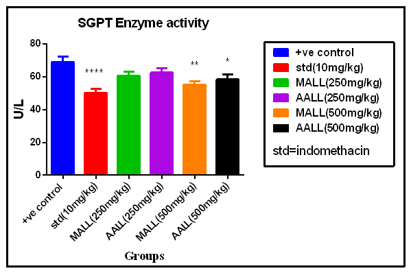Fig. 10: Result of the effect of MALL, AALL and indomethacin on serum glutamate pyruvate transaminase (SGPT) level; all values are mean±SEM. (One-way ANOVA followed by dunnett’s t-test: n=6 in each group). *p<0.05, **p<0.01, ***p<0.001 when compared with control