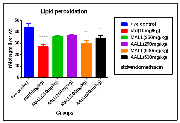 Fig. 11: Result of Biochemical Parameter on Liver Lipid peroxidation assay of MALL, AALL, and Indomethacin; all values are mean±SEM. (One-way ANOVA followed by dunnett’s t-test: n=6 in each group). *p<0.05, **p<0.01, ***p<0.001when compared with control