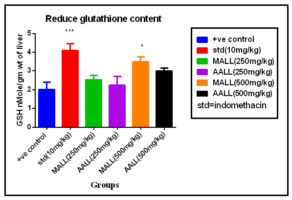Fig. 12: Result of reduced glutathione (GSH) assay of MALL, AALL, and Indomethacin; all values are mean±SEM. (One-way ANOVA followed by dunnett’s t-test: n=6 in each group). *p<0.05, **p<0.01, ***p<0.001when compared with control