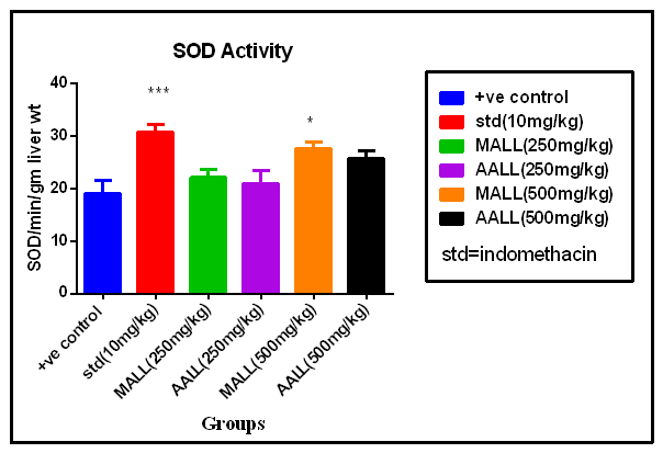 Fig. 13: Result of Superoxide Dismutase (SOD) assay of MALL, AALL, and Indomethacin, all values are mean±SEM. (One-way ANOVA followed by Dunnett’s t-test: n=6 in each group). *p<0.05, **p<0.01, ***p<0.001when compared with control