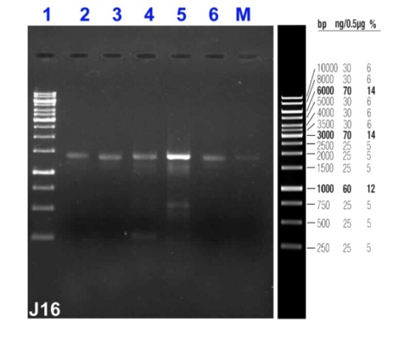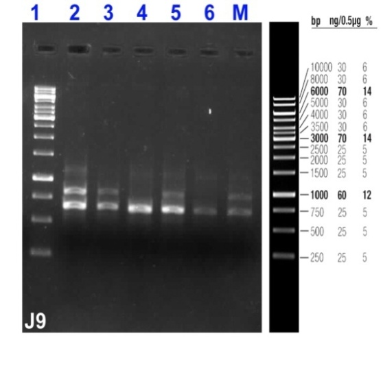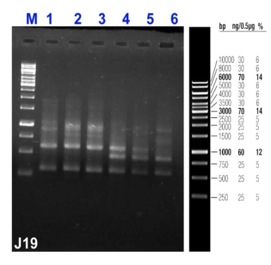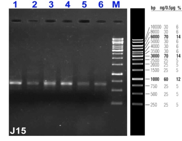 Fig. 1 represents the RAPD profiles for each primer. Two primers OPJ6 and OPM2 produced 100% discrimination power. Primers OPJ18, OPJ19, OPJ9, OPJ16, OPJ15 and their polymorphisms are 83.33%, 80%, 66.8% and 0% The maximum number of polymorphic bands (6) were obtained with primers OPM2, OPJ18 and the minimum number (1) were obtained with primer OPJ15. The polymorphic percentage ranged from 0% to as high as 100%. The size of the amplified fragments varied between 250 and 9000bp. Primers OPJ6, OPM2 showed 100% polymorphism when compared to other primers.