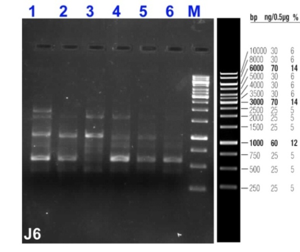 Fig. 1: The RAPD profiles of S. alternifolium generated by OPJ series primers. Samples 1-6 S. Alternifolium Individuals. M-1 kb DNA ladder