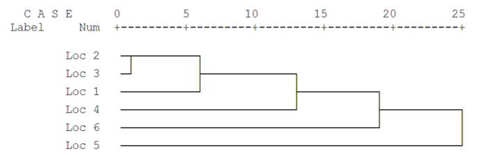 Jaccard’s similarity matrix was prepared based on RAPD data. and the dendrogram, clustering (Figure. 2) based on similarity coefficients generated by the Unweighted pair group method using arithmetic means (UPGMA), using SPSS (11.0) software. Jaccard’s similarity co-efficients of the amplified bands for S. alternifolium species (table 3). A maximum similarity value of 76.5% was observed between accessions 3 and 2 accessions, followed by 71.4% between 2 and 1 and a minimum of 27.8% between 5 and 3. An average similarity value observed across the each accession was 12.14%. The dendrogram constructed (six accessions into the single cluster) based on the similarity co-efficient, the cluster having 2, 3 and 1 accessions are genetically similar. But accession 4 in this cluster has different similarity value.571. Whereas the accession 6 and 5 did not resemble with any other in the cluster formed a separate branch.