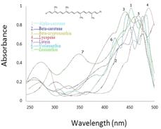 Carotenoids act as antioxidants due to the ability to quench ROS such as singlet molecular oxygen or superoxide, peroxide and hydroxyl radicals generated by exposure to UV radiation. These radicals damage cells by initiating a lipid peroxidation[56]. Carotenoids may be responsible for the decreased cancer incidence associated with the consumption of certain fruits and vegetables. Carotenoids such as alpha-carotene, beta-carotene, beta-cryptoxanthin and lycopene also contribute to UV protection (fig. 5).