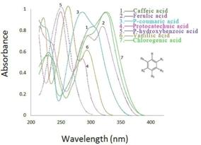 On the other hand, ferulic and p-coumaric acids are found in corn, oat and wheat grains. Ferulic acid exhibits a maximum absorbance at 215 nm with additional peaks at 287 nm and 312 nm. In contrast, p-coumaric acid displays a maximum absorbance at 286 nm with additional peaks at 209 nm and 220 nm (fig. 8) [69].